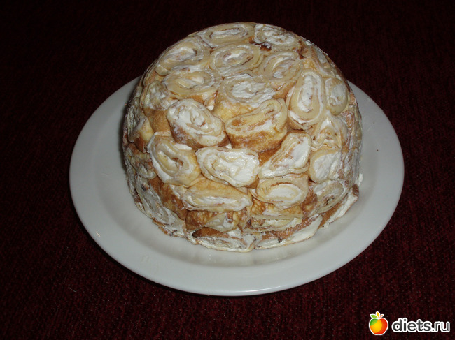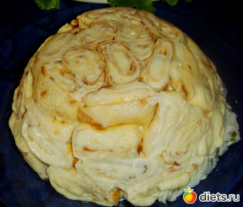 Этот рецепт я видела на сайте Поваренок и так мне понравился вид этого салата, что я планировала его обязательно сделать. Но я взяла от туда только идею внешнего вида, а начинка, в принципе может быть любая, только салат должен быть достаточно густой и не расплываться. Я для примера я пишу тот, который делала, но так же можно сделать и с "оливье", и с другим подобным по консистенции салатом..