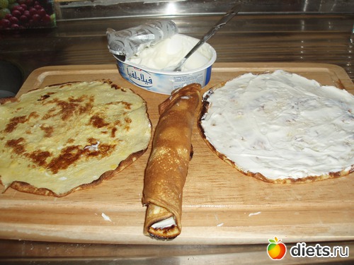 На получившиеся блинчики наносим тонким слоем сыр Филадельфия( можно и майонез) и заворачиваем их в рулетики.