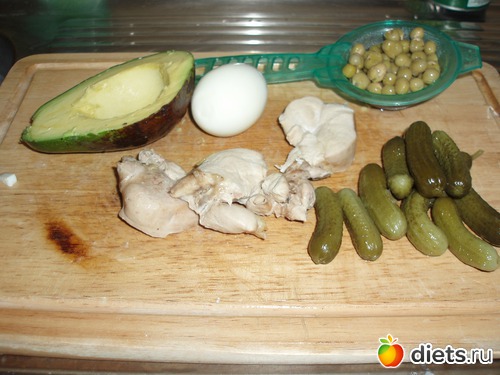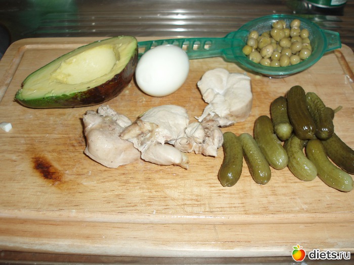 Готовим салат из яйца, огурцов, авокадо, куриного отварного мяса( я брала грудинку) порезав кубиками. Добавляем горошек, оливки( я взяла уже порезанные) и мешаем все с майонезом( легкий).