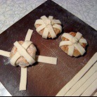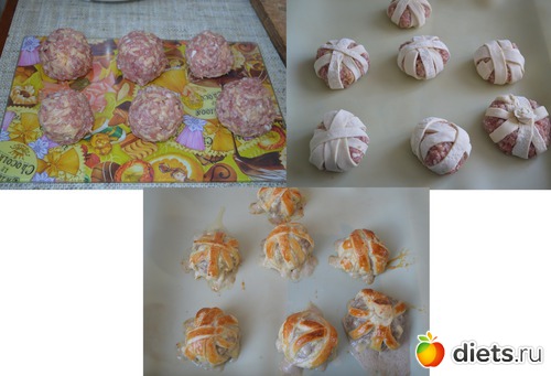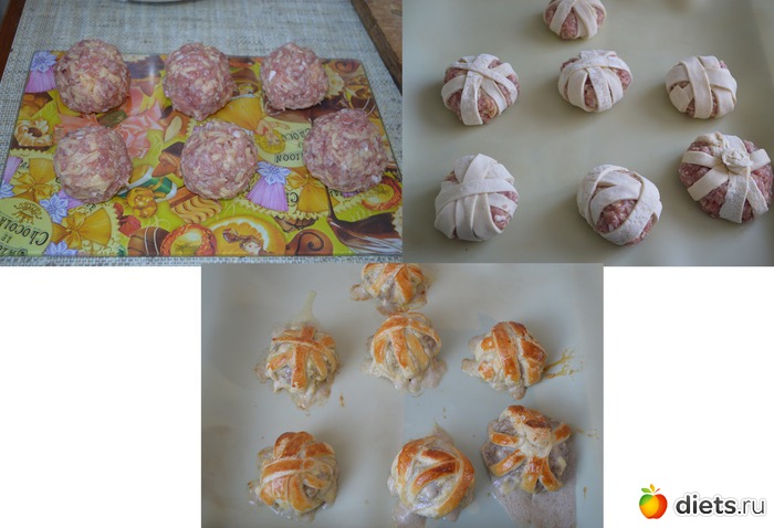 Из фарша делаем клубочки и полосками обматываем их. Полоски можно наматывать как угодно, в любом направлении или взять 8 полосок и крест на крест соединить их, вот так