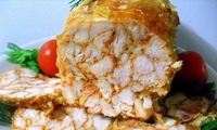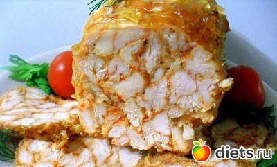 Куриное филе нарезать небольшими кусочками, добавить мелко нарезанный чеснок, паприку, зелень, перец, соль, сухой желатин, всё хорошо перемешать. Выложить в рукав для запекания, плотно закрепить, пакет положить в форму для запекания.