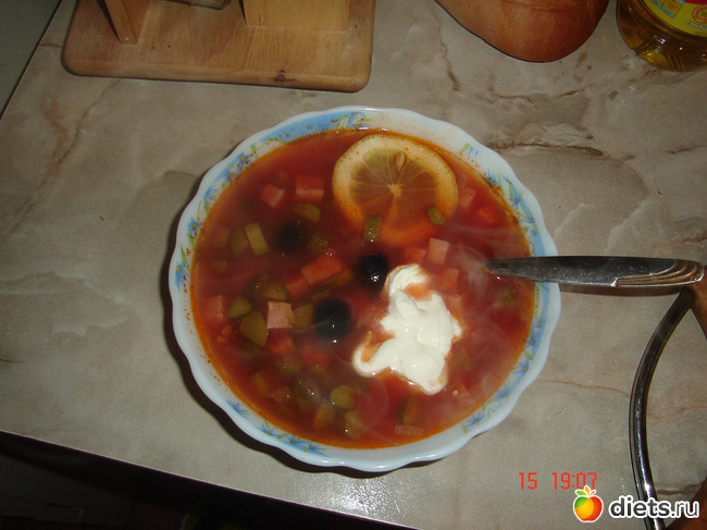 Подавать с маслинами, лимоном и сметаной - это в оригинальном рецепте и так я сервировала порцию для мужа ну и сфотографировала заодно, себе я просто в тарелку с солянкой добавила 1 кусочек лимона.