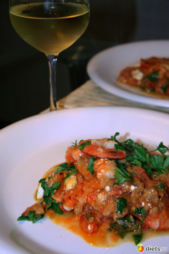Вынимаем из духовки, посыпаем свежей нарезанной петрушкой и- к столу. Очень хорошо с креветками саганаки подать ретцину – греческое сухое белое вино с выраженным хвойным ароматом из-за добавления сосновой смолы, но любое сухое белое вино будет к месту.