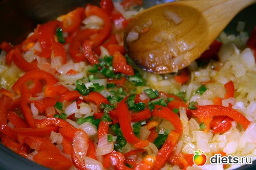 Лук режем кубиками, сладкий перец полосками, и мелко-мелко – острый перец. Кладем в глубокую сковороду с разогретым оливковым маслом и тушим минут 7-8 до прозрачности лука, в конце добавляем измельченный чеснок и орегано.