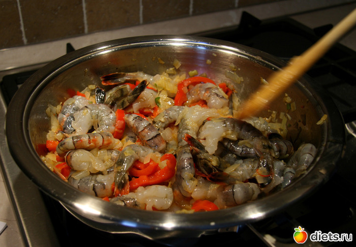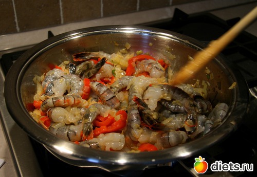 Увеличиваем огонь и быстро кладем креветки, все время их помешивая.