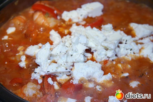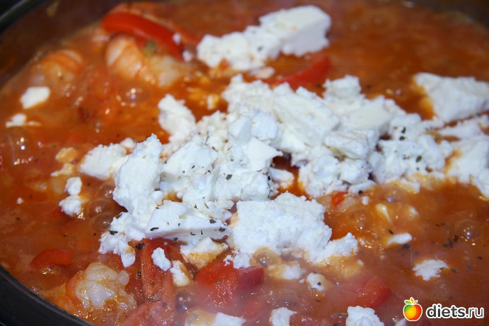 Теперь пора добавить мелко нарезанные помидоры вместе с соком, сахар и томат-пасту. Тушим еще минут 5. Добавляем мелко раскрошенный сыр «Фета» (примерно 2/3 от общего количества), и еще минуты 3 тушим. Если помидоры слишком водянистые, их лучше до того, как добавить к креветкам, протушить в отдельной посуде подольше, чтобы лишняя влага выпарилась. Можно в процессе тушения немного посолить блюдо, но не перестарайтесь: сыр достаточно соленый, поэтому соли нам потребуется добавить совсем чуть-чуть.