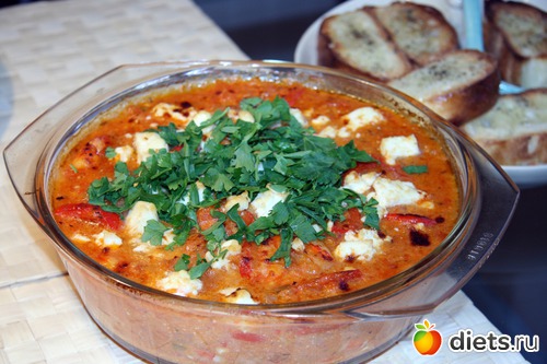 После окончания тушения перекладываем содержимое сковороды в жаропрочную посуду, сверху посыпаем раскрошенным сыром, который мы оставили про запас, и ставим под гриль на 5 минут либо в сильно нагретую духовку, чтобы сыр сверху слегка расплавился. На другой противень можно одновременно разложить куски хлеба, сбрызнутые оливковым маслом и посыпанные орегано. Они нам понадобятся, чтобы доедать вкуснейший соус .