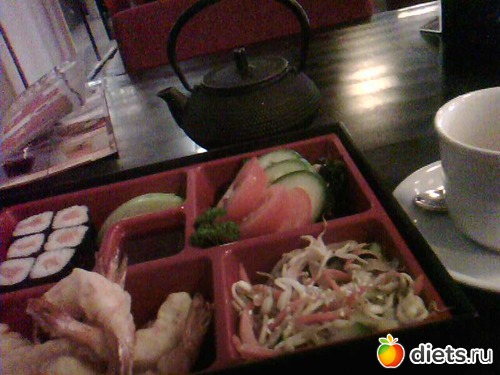 В обеденный перерыв пошли с подружкой на азиатский ланч. Оттянулись! Я - с креветками-темпура, ростками сои и вакамэ: