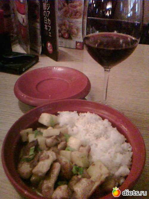 А после работы я думала, как похудеть (!) и как жить дальше за курицей карри с ананасами и яблоками с бокалом красного: