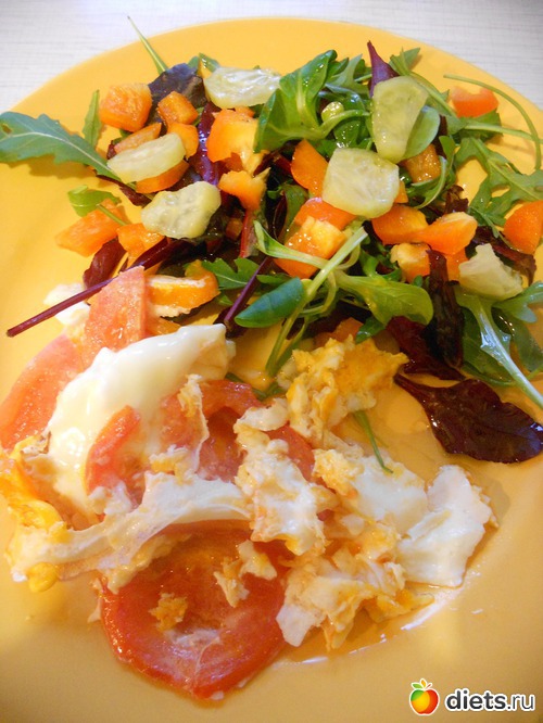 Ужин был скромненьким, муж умотал на мальчишник по случаю ДР коллеги, а я сделала себе яичничку с помидоркой и салатик: