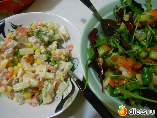 Сделала два салатика - тот, что справа, из микса рукколы, корна и мангольда с перчиком, помидорчиком и огручиком, заправлен нерафинированным подсолнечным маслом и лимонным соком, тот, что слева - из курицы-помидора-ананаса-кукурузы-лука с йогуртом и петрушкой, рецепт где-то давным-давно подхватила, назвала его "Рубин Каира":