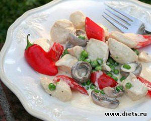 Данный рецепт курицы по-королевски, можно приготовить заменив филе курицы на филе индейки, белое вино на херес, а овощи предложенные в рецепте, на любые другие по Вашему вкусу.