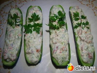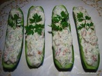 Огурцы моем, режем вдоль пополам. Аккуратно вырезаем мякоть, чтобы получились "лодочки".