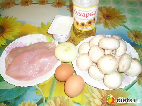 Мелко порезать половинку луковици и слегка обжарить на 1 чайн.ложке подсолнечного масла. К луку добавить мелко порезанные шампиньоны, перемешать и слегка обжарить. Добавить 1 яичный белок, 1 столов.ложку йогурта, соль, перец. Все перемешать и прогреть пока начинка не загустеет