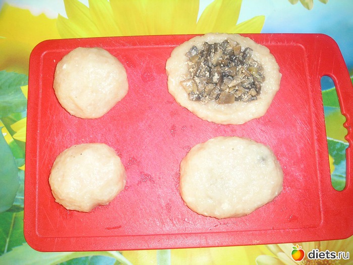 Из куриного фарша сделать шарики, расплющить их в лепешку. В середину лепешки положить грибной фарш и слепить края как у пирожков. Все это делать хорошо мокрыми руками.