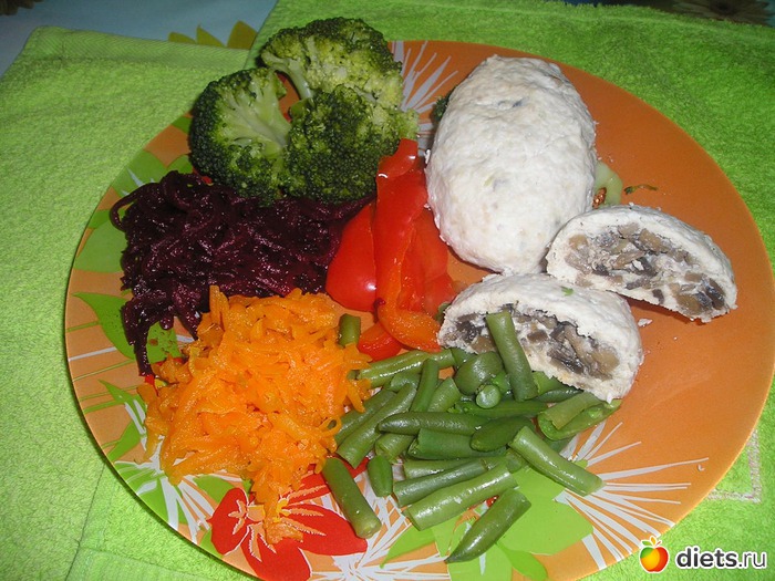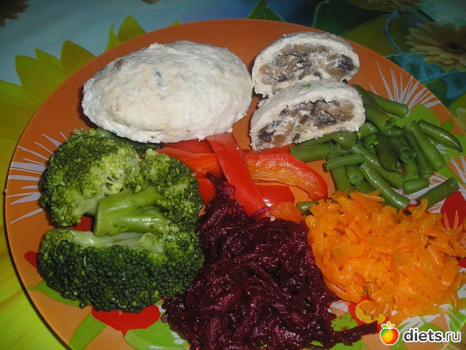 Сервировала с овощами которые тоже готовились в пароварке и салатом из вареной свеклы и морковки.