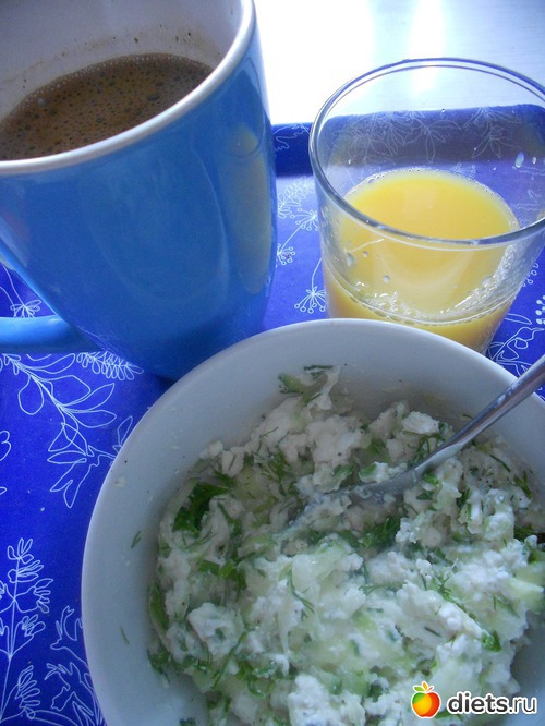 Завтрак - апельсиновый сок, кофе, творог с зеленью: