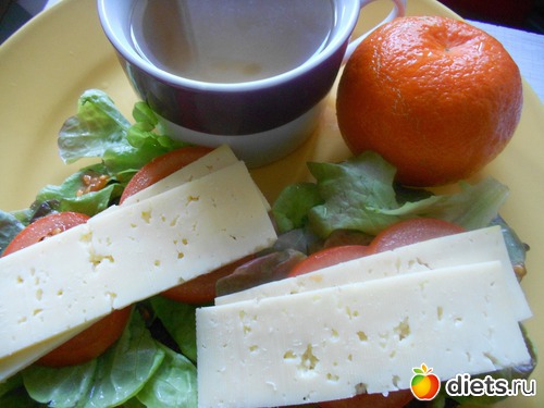 Обед - ржано-пшеничная булочка с листьями салата, помидором и сыром, мандарин, чай: