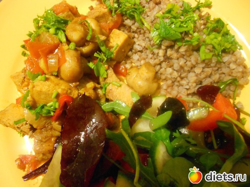 Ужин - свинина с паприкой и грибами, гречневая каша, салат, чай: