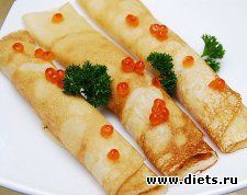 6 столовых ложек муки + 2 ст л крахмала + 1 ст л сахара + 1 ч л соли смешать все в чаше. Затем добавить 4 яйца. опять перемешать. Потом вливаем 500мл теплого молока и перемешиваем хорошо. В конце добавить 2 ст л растительного масла. Выпекаем наши блинчики. На остывшие блинчики ложим 1-2 ч л икры и маленький кусочек сливочного масла. Заварачиваем трубочкой и обжариваем на маленьком огне. Внимание! Главное не передержать - иначе икра испортиться.