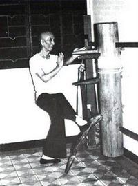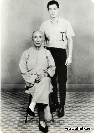 Так вот, она как раз из этого стиля. Буквально вскользь расскажу про Вин-Чунь, потому что страсть хочется обо всем тут написать, всем поделиться, но боюсь вам может это быть нудно и не интересно как минимум. Есть три легенды основания стиля Вин-Чунь. Самая мне понравившаяся гласит, что стиль был основан женщиной Янь Юнчунь (Янь Вечная Весна), дочерью шаолиньского послушника. Однако, это легенда считается романтизированной и как такого монастыря, при котором этот послушник служил и не существовало вовсе. НО! Женщина стиль основала... круто же )))) Стиль считается плавным и не агрессивным. Уходы с линии атаки дополняются мгновенными прямолинейными атаками при сближении на крайне близкое расстояние. Зачастую бой завершается ударами колен и локтей. Упражнение «липкие руки» позволяет бойцу отлично ориентироваться в бою на близких дистанциях. Существуют и ножевые техники, они тесно связаны в единое целое с техникой рук и приёмами без оружия. Вместе с «липкими руками» изучаются броски и захваты. Одними из самых знаменитых последователей этого стиля являются Брюс Ли и его учитель Ип Ман. Кстати, на фото выше с тренажером как раз изображен сам Ип Ман, ниже Ип Ман со своим знаменитым учеником.