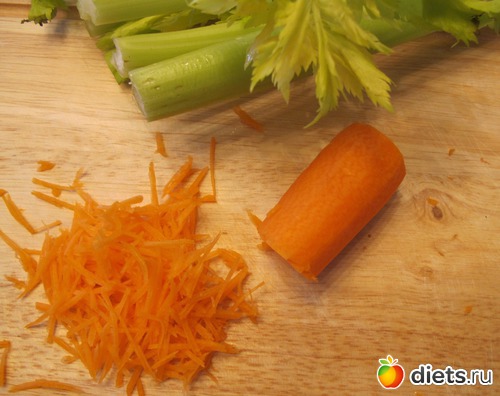 Второй помидор и часть перца порезать кубиками. Остальной перец и стебель сельдерея порезать небольшими долька.