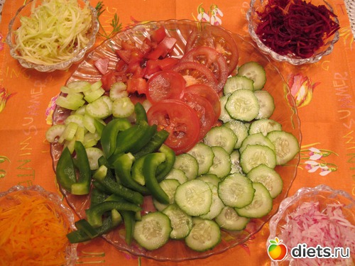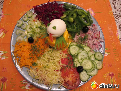 По бокам в виде сегментов выложить овощи, лучше соблюдать цветовую последовательность (чередовать красные, зеленые, желтые).
