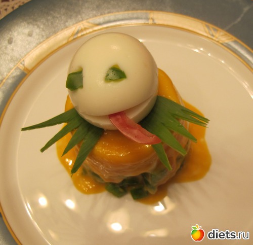 Выложить на большую тарелку по центру запеченное с овощами яйцо и на него посадить лягушку.
