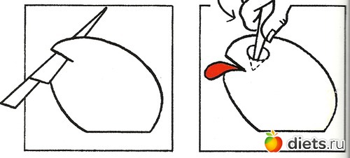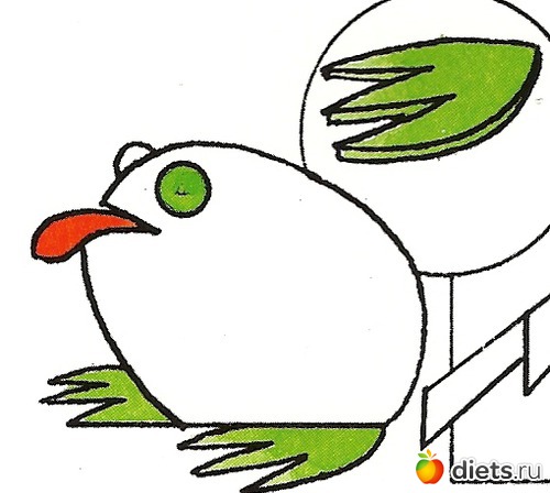Вырезать ножом углубления для "глаз". Укрепить в них зеленые горошины или кусочки перца. Из лука порея сделайте лапки.