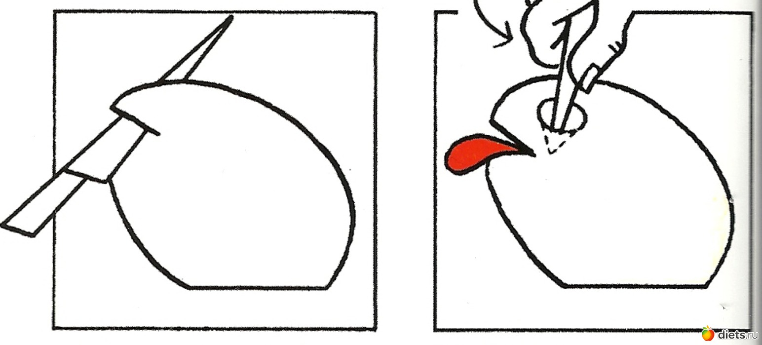 У вареного яйца срезать основание и в верхней части сделать небольшой вырез. Вставить в него маленький кусочек помидора(" язычек")