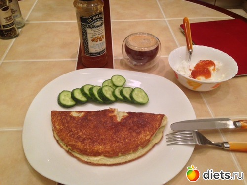 Омлет из 2 целых яиц и 1 белка, огурец, 20 грамм сыра 17%, 100 грамм творога 0% с чайной ложечкой джема без сахара и кофе.