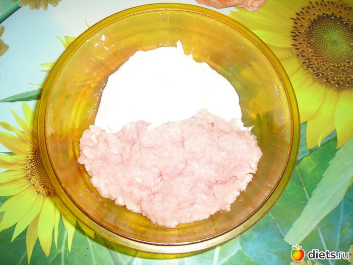 Отделить желтки от белков, желтки размешать, добавить кефит, творог и все перемешать с куриным фаршем.