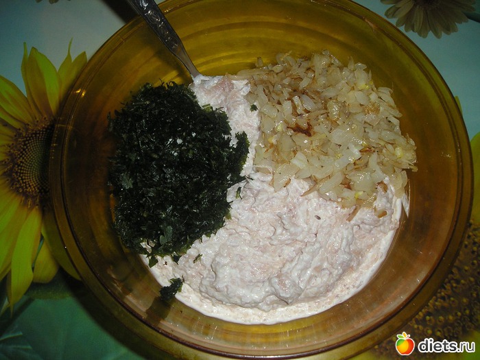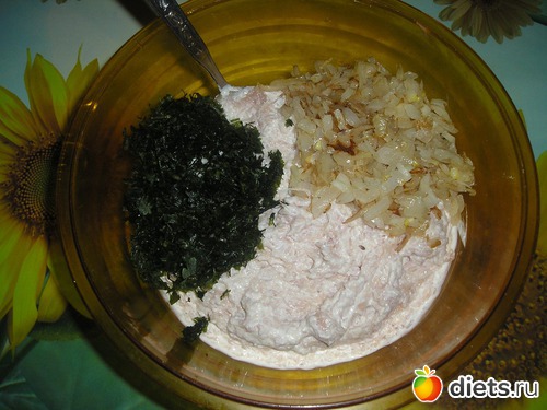 Петрушку мелко порезатьи добавить ее вместе с жареным луком в фарш, добавить крахмал, соль, перец и все перемешать.