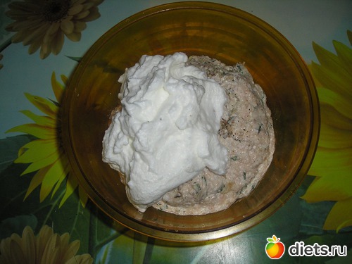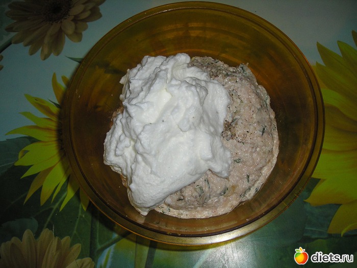 Охлажденные белки взбить в крепкую пену и аккуратно ввести в фарш, осторожно перемешать.