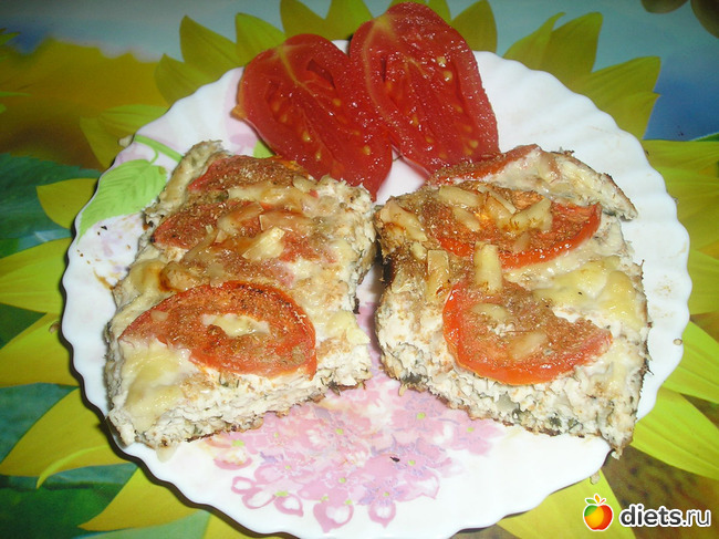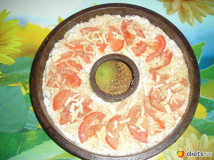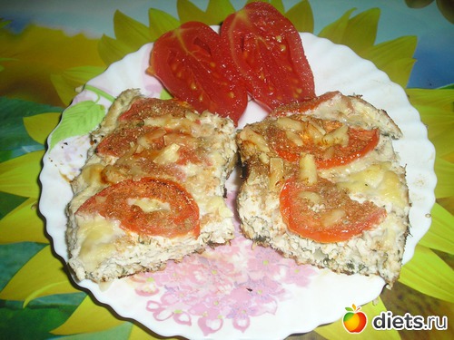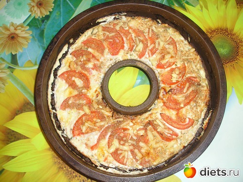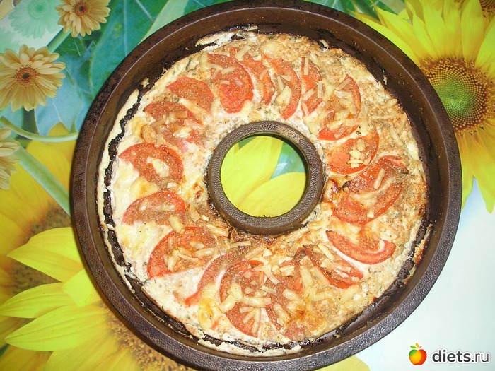 Форму смазать растительным маслом и слегка присыпать отрубями. Выложить фарш в форму, сверху выложить порезанные помидоры, мелко порезанный сыр и присыпать отрубями.