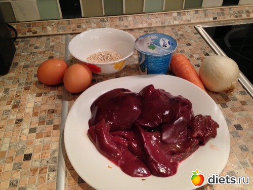 Печень, морковь и лук прокрутить через мясорубку или измельчитель. Яйца взбить вилкой с солью и перцем. В печень добавить яйца. Добавить йогурт, отруби и перемешать. Масса должна быть как на оладьи, достаточно жидкая.