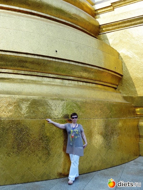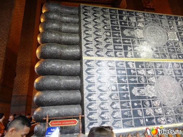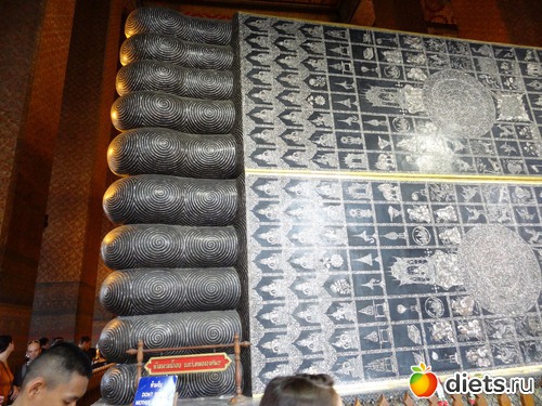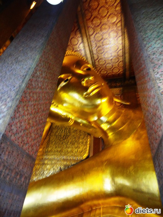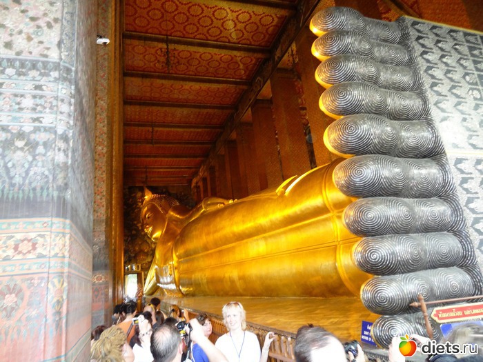 Потом нас повели в храм Лежащего Будды, 47 метров в длину, с разрисованными изречениями ступнями. Леша, гид, предупредил, что снять его в полный рост можно только от ступней. Это единственный возможный ракурс.