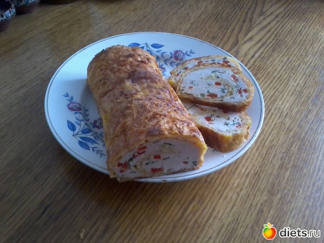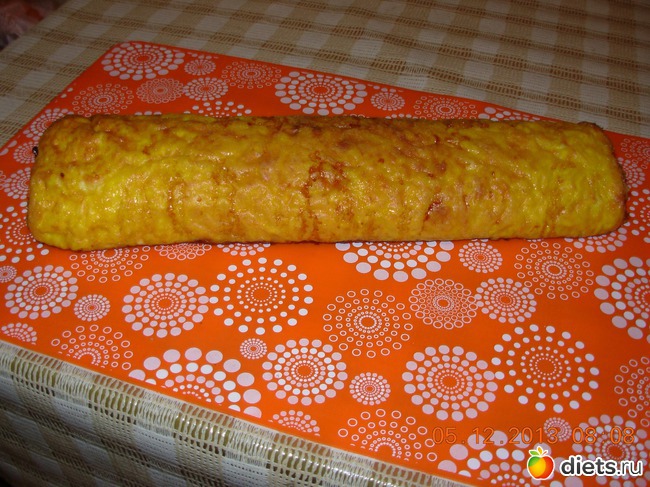 Готовый омлет остудить и выложить на стол (толщина омлета 0,5см (+-2мл)). На середину готового омлета выложить фарш и аккуратно скрутить рулет.