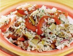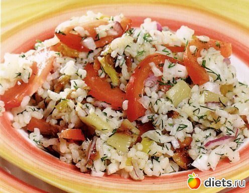 4. Смешайте рис, морковь и цуккини в большом салатнике. Добавьте рубленый укроп, уксус и масло. Перемешайте. Добавьте соль и перец по вкусу.