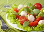 4. Белый лук нарежьте полукольцами. Шарики моцареллы выньте из рассола и вместе с кусочками курицы выложите сверху на листья салата.