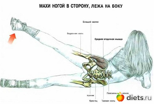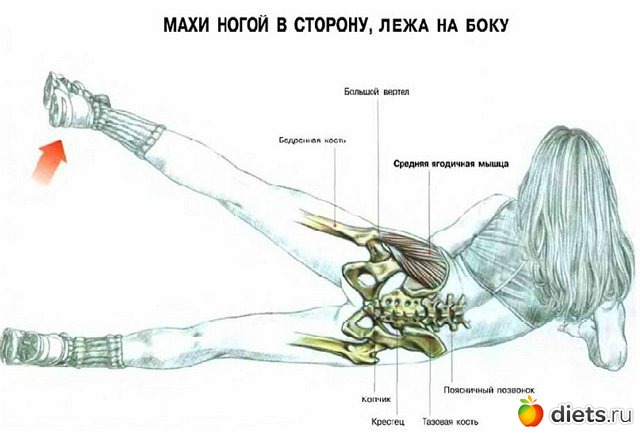 Лягте на левый бок, опора – на локоть. Согнув в колене правую ногу, поставьте ее перед левым бедром. Сделайте 20 махов прямой ногой. Перевернитесь на другой бок. Важно: напрягайте икру и тяните мысок.