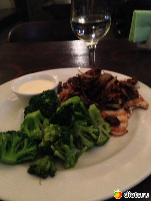 ), водичка без газа, брокколи на парУ, куриная грудка на гриле, а сверху на грудке куриная печень с луком