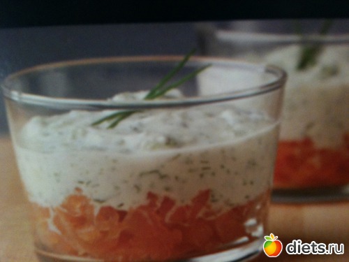Или подать в прозрачном стаканчике мелко нарезанную рыбу, сверху положить 1-2 столовые ложки пате.