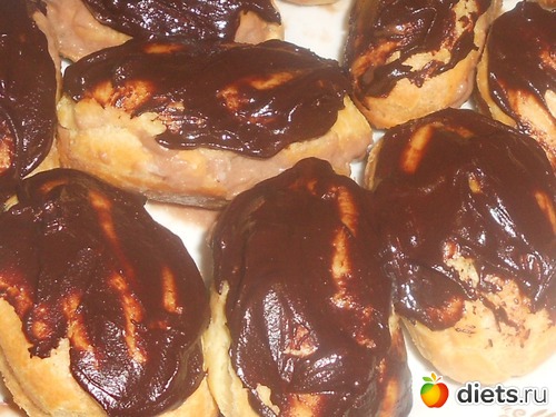 Я их мастрячила 2 часа. Ужас в том, что у духовки отваливается дверца и не регулируется температура, кондитерского шприца у меня нет (поэтому тесто выдавливала из целлофанового пакета, а запрявляла пирожные кремом через надрезы ложкой), поэтому не судите строго, вот что в результате вышло: