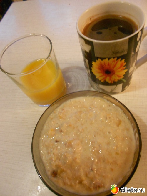 Завтракали овсянкой с сухофруктами, пили сок и кофе: