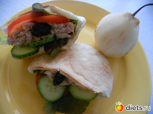 Обед - пита с тунцом, огурцом, помидором и салатом, груша: