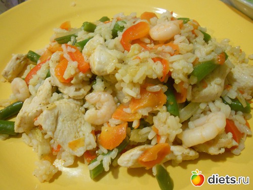 Добавьте 50 г очищенных отварных креветок и рис, перемешайте, готовьте еще 3-5 минут на медленном огне.