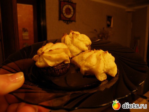 . Теперь берем кондитерский мешочек с насадкой звездочкой, наполняем его еще теплым пюре и выдавливаем в грибные шляпки, если есть сыр, можно чуть- чуть присыпать. Теперь в духовку на полную мощность( у меня 250 градусов) на 15- 20 минут. Картошку я считала как до насыщения, плюс накинула пунктик за яйца, так что совсем не много получается.