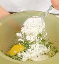 Сложить нарезанную капусту в миску, добавить яйца, соль и муку,