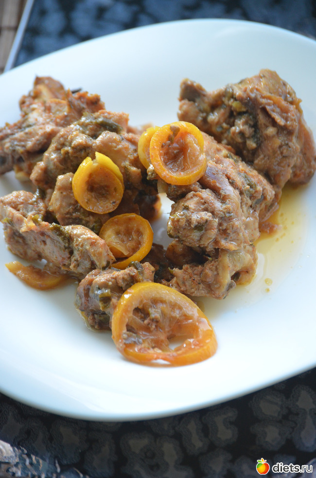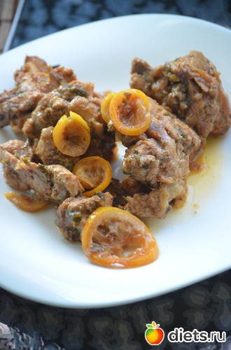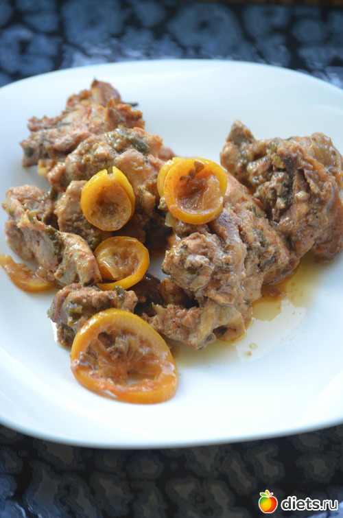 Лимон порезать кружочками, добавить к курице (из одного кружка выжать сок). Хорошо перемешать. Поставить в холодильник на 30 минут для маринования.